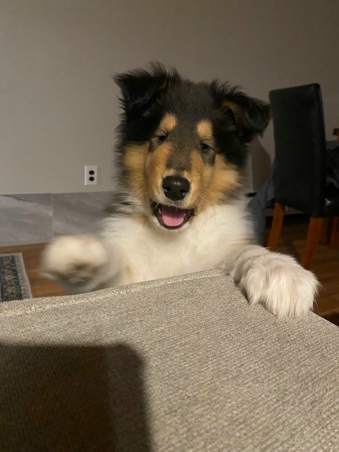 Patti I enjoyed meeting you today. All your collies are breathtaking.He is already a cuddler and he walks with the halter and leash on in front of me. In time he will learn to walk beside me.